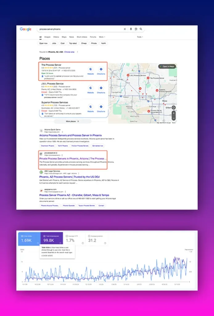 I’ve successfully ranked websites for competitive keywords like “process server Phoenix” for processserver.io. My SEO approach focuses on thorough keyword research, on-page optimization, and content strategies that drive measurable results.